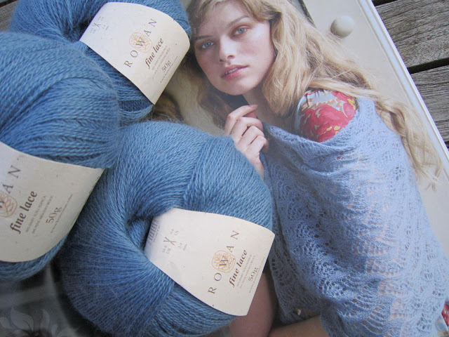 ..... but it just didn'e seem to be quite right (not that I'm terribly fussy, you'll understand!). I cast on several times this week, but my heart wasn't really in it and I made silly errors that were impossible to correct, meaning that I had to frog and cast on all 210 stitches again. Please, bear in mind that this was only the third yarn and colour choice that I had tried so far and not been happy with. Not to be beaten, I frogged again and cast on with a new colour that I am, at last, much happier with. It almost the exact colour of my jacket and will blend with my dress colours too. If I'm honest, I'm not really in love with the Rowan 'fine lace' yarn, but the colour is good and I seem to have wasted hours scouring the internet for the illusive perfect colour. I would have preferred a silk blend, but never mind. The 80% baby alpaca and 20% merino mix will produce a light, wafty covering; just perfect for the wedding evening.